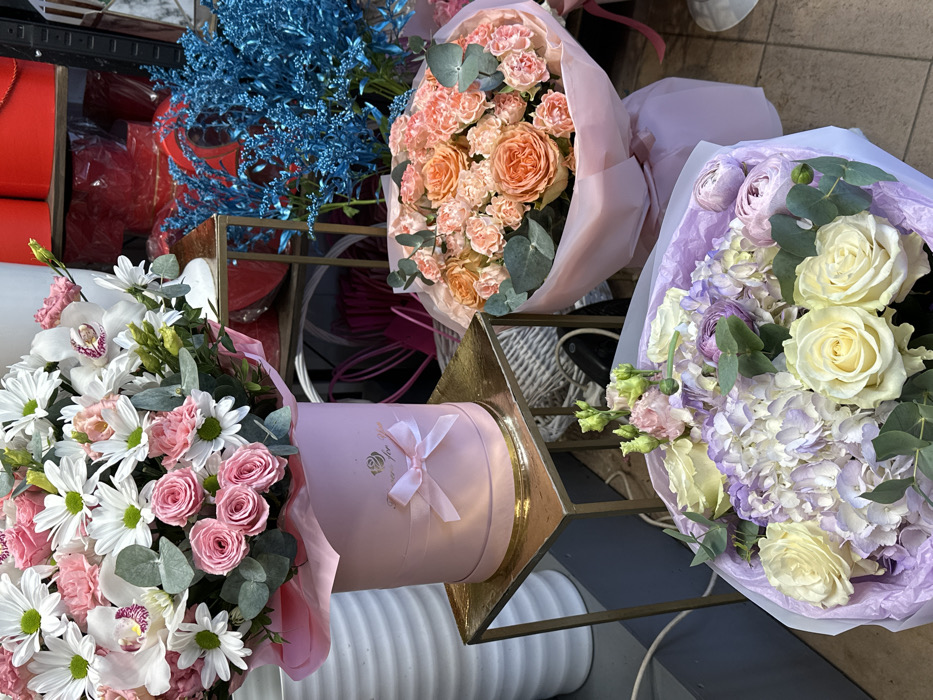 The scene depicts an interior view of a flower shop, located in Liepaja, Latvia. The primary focus is on multiple floral arrangements displayed for sale. In the upper left, a large, cylindrical pink hatbox with a light pink ribbon bow on its side sits on a brass-toned metal display stand. The hatbox contains a dense arrangement featuring white daisies, light pink spray roses, white orchids, and pink carnations, interspersed with green eucalyptus leaves. The hatbox is branded with a faint gold "Flower for You" logo. To the right, on the floor, is a medium-sized bouquet wrapped in light pink paper, comprising peach and orange roses, peach-colored mini carnations, and eucalyptus foliage. In the foreground, another bouquet is wrapped in light purple paper. This arrangement includes cream-colored roses, light purple hydrangeas, purple ranunculus, and green eucalyptus leaves. The background shows commercial shelving with various items. Red cylindrical hatboxes or gift boxes are stacked on a shelf. Below these, a vibrant blue mass of dried or dyed floral branches or foliage is visible. To the left of the pink hatbox, a tall, white, ribbed cylindrical object is partially visible, likely a vase or container. The floor appears to be tiled, and other unseen shop paraphernalia, possibly including wicker baskets, is present in the deeper background. No individuals are present in the image.