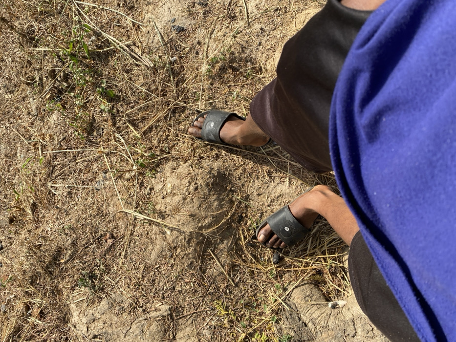 A person wearing black sandals stands on dry, grassy ground. The individual's feet are dark-skinned, and they are wearing dark-colored shorts and a blue shirt. The ground appears to be a mixture of dirt, dry grass, and some small patches of green vegetation. The lighting suggests it is a sunny day.