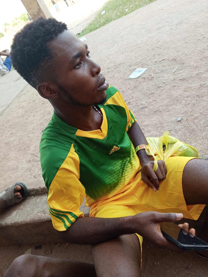 A young adult male, dark-skinned with short, dark curly hair and a light beard, is seated outdoors in Ihiagwa, Nigeria. He is wearing a green and yellow short-sleeved Adidas sports jersey with a V-neck and matching yellow shorts. His body is angled slightly, and his head is turned to the right, looking upwards. On his right wrist, he wears a yellow-orange wristband with the partial text "BLOOD OF" visible. His left hand holds a black smartphone with a dark case, while his right hand holds a crinkled yellow plastic bag resting on his lap. He is sitting on a low concrete step or ledge. To his immediate left, a partial view of another person's leg and a brown sandal is visible. The immediate ground is light brown dirt or packed earth, with scattered debris including a white plastic wrapper and small stones. In the distant background, blurred figures and sparse vegetation are discernible under natural daylight.