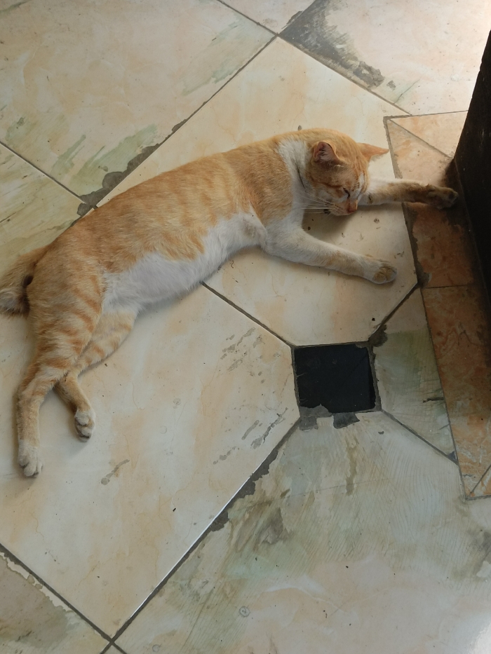 - "A domestic cat, predominantly orange with white markings on its belly, chest, paws, and face, is observed lying prone on a tiled floor in Kecamatan Pati, Indonesia" by FM-CLdPk2, licensed under CC BY 4.0