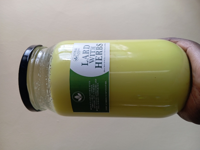 The image displays a clear glass jar with a black screw-on lid, held from below by a dark-skinned hand. The jar is filled with a light yellow, opaque substance consistent with rendered fat. A white and green label is affixed to the jar. The white section of the label, on the right, prominently features the text "LARD WITH HERBS" below the "VITAL LIVING" brand logo. A smaller text beneath reads "Home Made With Love And The Best Of Nature." The green section of the label, on the left, describes the contents as "RENDERED AND INFUSED WITH WHOLE GARLIC GINGER, ROSEMARY AND TURMERIC. KNOWN ANTI INFLAMMATORY AND ANTIOXIDANT PROPERTIES." Below this, "STORE AT ROOM TEMPERATURE" is visible. The background is a plain, light-colored wall. The scene does not contain specific visual identifiers for Ewuaso Oonkidong'i ward, Kenya, but depicts a product that could be found or sold within that locale. No other individuals or actions are depicted.