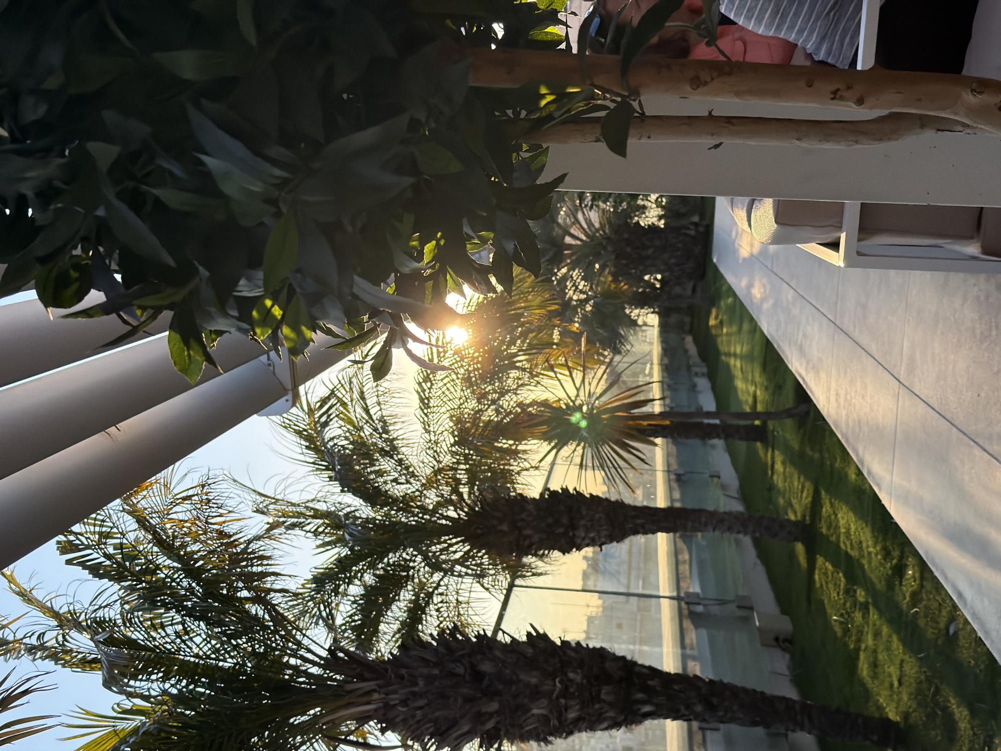 The image captures an outdoor terrace or elevated garden in València, Spain, during golden hour. A white architectural element, likely part of a pergola, is visible in the upper right, partially obscuring a small tree with dark green leaves and two light-colored trunks. To the immediate right, a section of a white outdoor sofa with beige cushions is occupied by two partially visible individuals; one wears a striped shirt, and the other a pink garment. A light-colored paved walkway extends diagonally across the midground from the lower right. To the left of the walkway, a strip of green grass features elongated shadows cast by unseen objects. Beyond the grass, a transparent glass barrier provides a view of a row of mature palm trees with dark, textured trunks and green fronds. The setting sun, a bright golden orb, is positioned low in the sky, visible through the fronds of the palm trees and casting a strong glare. The background presents a blurred cityscape of València under an orange-yellow sky.