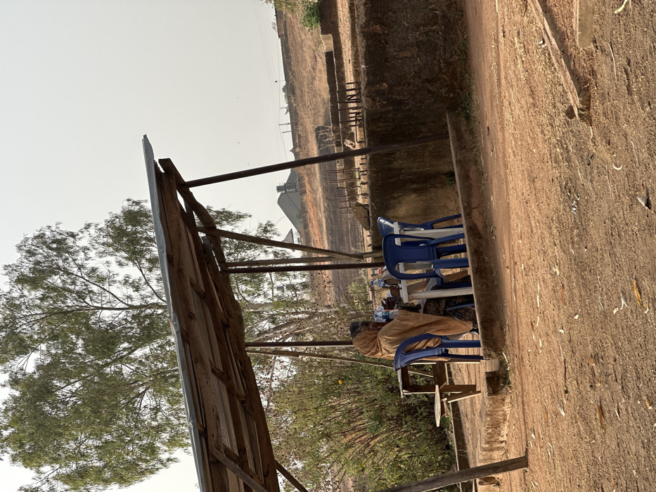A scene depicts a person seated at a white table under a simple wooden shelter. Blue plastic chairs surround the table. A tree extends over the shelter, its branches visible in the light sky. Behind the seating area, a low stone wall borders a dry, open landscape with sparse vegetation. A building is partially visible in the distance. The foreground consists of a dirt surface. The photo is taken in portrait mode.