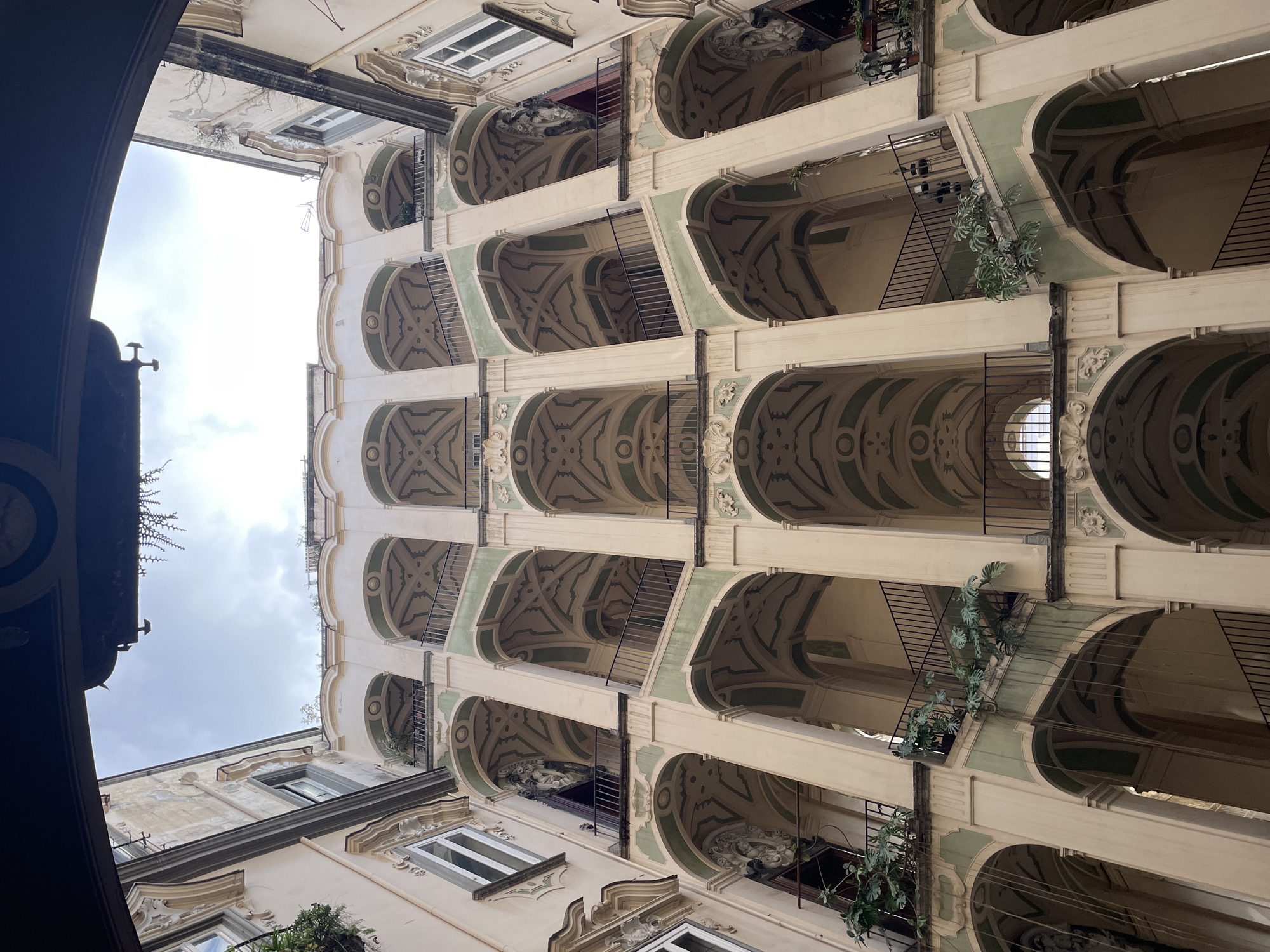 The image displays an upward-looking view from within the central courtyard of the Palazzo dello Spagnolo in the Rione Sanità district of Naples, Italy. The scene is dominated by a multi-tiered, symmetrical architectural structure featuring an elaborate "hawk's wing" grand staircase system. The building's facade is primarily light beige, complemented by sage green accents on the interior of the numerous semicircular arches, vaulted ceilings, and decorative panels. Robust pillars support the arches, forming open loggias on each floor. The ceilings of these loggias exhibit intricate geometric patterns in beige and sage green. A double-ramp staircase with dark metal railings ascends vertically through the open arches, connecting multiple levels. Dark metal railings also secure the edges of the balconies. Ornate, sculpted decorative elements, possibly busts or cartouches, are visible above some arches, particularly on the left side of the frame. Closed windows with white frames are visible on the outer walls of the courtyard, flanking the main staircase structure. Potted plants with large green leaves and some hanging vines are strategically placed on various balconies and along the staircases. The sky, visible through the open top of the courtyard, appears bright and overcast. No individuals or active interactions are present within the scene.
