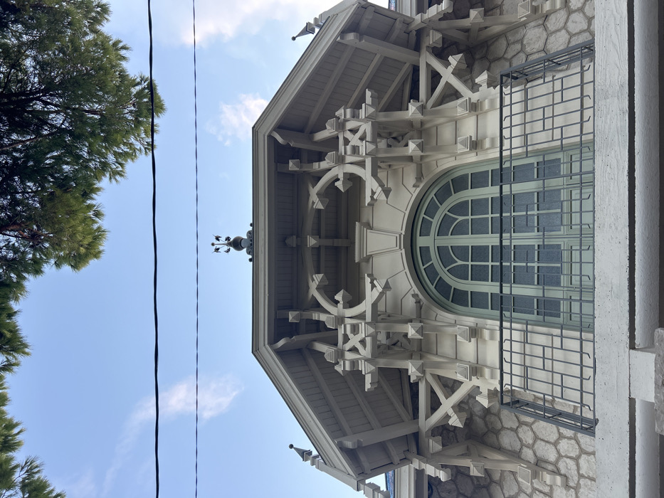 This image presents an upward-angled view of the upper facade of Villa Les Mimosas, also known as Villa Fontvieille, located at 12 bis Chemin du Crouton in Antibes, France. The building displays intricate Art Nouveau architectural elements. The structure's upper section features deeply overhanging eaves, supported by a complex arrangement of decorative wooden brackets and crisscrossing members, all painted in a light beige hue. A dark metal finial or weather vane is positioned at the central peak of the roofline, partially visible. Below the eaves, the wall surface is smooth and light-colored. A large, arched double door, framed in a light green color and featuring multiple panes, occupies the central facade. This door opens onto a balcony equipped with a dark metal railing showcasing a geometric grid pattern. The balcony's base is a light grey concrete structure. Below the balcony, the building transitions to a rustic stone base composed of irregularly shaped, light-toned blocks. The environment consists of a clear blue sky with minimal, wispy white clouds. Dark green foliage, likely from a pine tree, partially frames the top edges of the image. Two dark, horizontal utility lines traverse the upper portion of the sky. No individuals or specific actions are depicted within the frame. The scene is illuminated by natural daylight.
