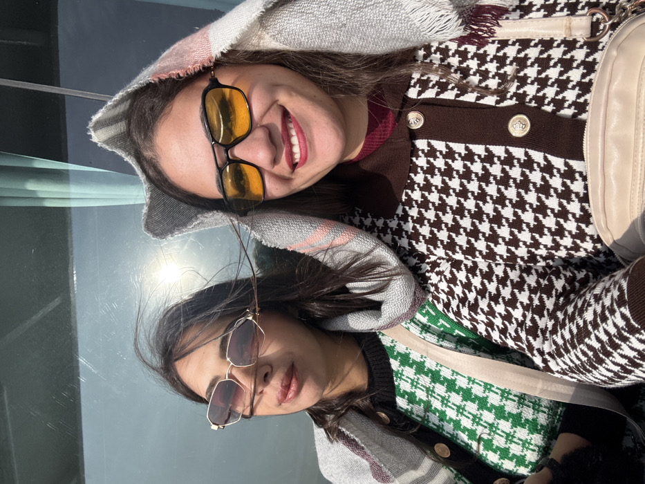 This image depicts two adult females seated, presumably within a vehicle or room, with the specified location being Beyoğlu, Turkey. The scene is brightly illuminated by natural sunlight, evident from a strong glare through a large window in the background, which also shows a pale sky and a light-colored curtain on the right. The female on the left has dark, wind-blown hair, and wears hexagonal-framed sunglasses with light-tinted lenses. She is dressed in a green and white houndstooth patterned sweater or cardigan, with a grey and multi-colored striped scarf draped over her left shoulder. A light-colored strap diagonally crosses her chest. Her expression is calm, with lips slightly parted, and she gazes upwards and to the left. The female on the right has dark hair partially covered by a grey and multi-colored striped scarf styled as a hood with a peaked top. She wears black-framed aviator-style sunglasses with yellow-orange lenses and a brown and white houndstooth patterned cardigan featuring a dark brown collar and central placket secured by circular gold-toned buttons. A dark red garment is visible underneath. She is smiling, showing her teeth, and looking directly towards the viewer. A light-colored bag is partially visible in the lower right foreground. The women are positioned side-by-side, occupying the majority of the frame.
