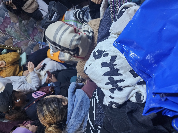 An indoor scene in Salé, Morocco, displays a dense grouping of at least five individuals surrounded by numerous personal effects. In the immediate foreground, a bright blue, tarpaulin-like carry bag is partially open, revealing bundled items, including a white garment with bold black "STARS" lettering. To the left, a woman with light brown hair tied in a bun wears a blue hooded top over a reddish garment. Adjacent, a woman wearing a black baseball cap, dark clothing, and white wireless earbuds holds a smartphone in her left hand and carries a burgundy shoulder bag. Further back, individuals include one wearing a light grey hooded sweatshirt holding a clear glass, another in a yellow jacket, and a person whose back is to the viewer, wearing a beige and brown striped head covering. Additional visible objects comprise a black bag marked "ISSUR," a plastic water bottle, and various piled textiles and bags. The background wall features botanical-patterned wallpaper with purple, green, and blue leaf motifs, along with a section of an ornate gold-colored mirror frame. The individuals are seated or leaning within a confined space, some engaged with personal electronic devices.