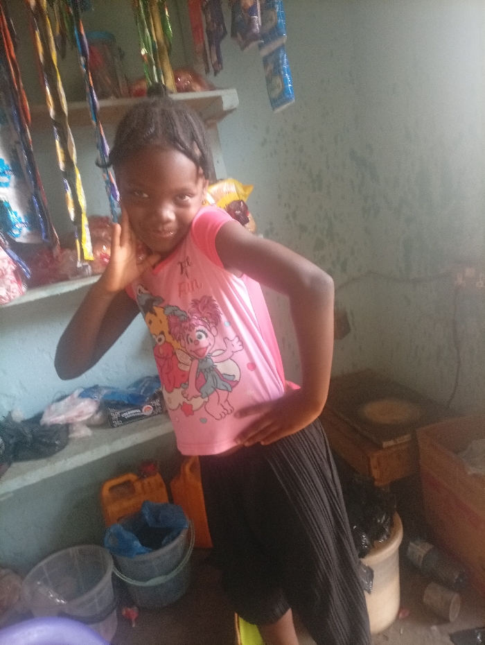 A young girl, with dark skin and braided hair, stands in an indoor setting in Yelwa, Nigeria, looking directly at the camera with a slight smile. She wears a pink t-shirt depicting Sesame Street characters Elmo, Abby Cadabby, and Grover, along with the text "Elmo's Play Fun," and dark, pleated pants. Her right hand is raised, fingers extended and resting near her cheek, while her left hand is placed on her hip. The background on the left features a light-colored shelving unit displaying various packaged goods, including snacks in blue and white packaging, as well as items stored in clear and black plastic bags. Below the shelves, on the floor, are multiple plastic buckets in grey, light blue, and purple, some containing blue plastic liners, alongside two orange plastic jerry cans. The wall on the right side of the image is a distressed, light blue-green color. A wooden table or counter is visible on the far right, with a large white bucket and other miscellaneous items on and around it.