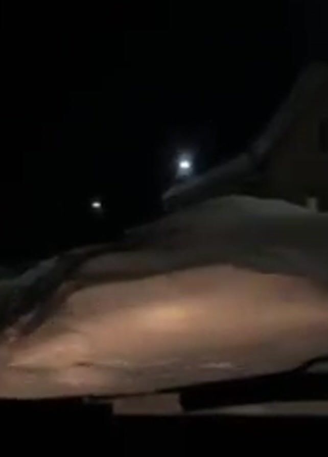 car driving at night through a snowy neighborhood. The street is covered in snow, and there are large snowdrifts along the sides of the road. A yellow house can be seen to the right of the road. Streetlights illuminate the area. There is music playing in the background.