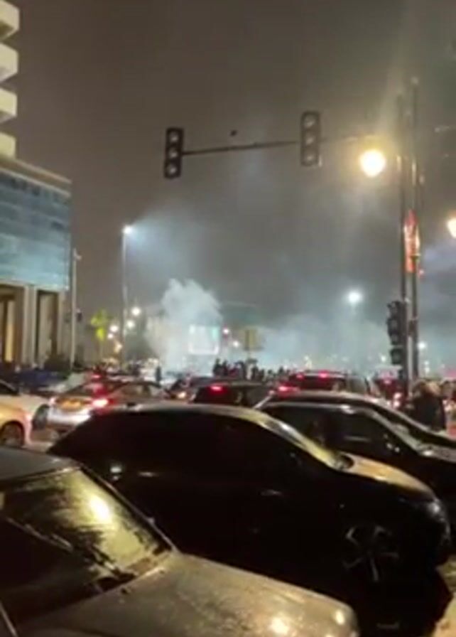 The video depicts a nighttime scene on a city street, likely during a celebration or gathering. Numerous cars are parked along the side of the road, with people visible on top of and around some of the vehicles. There is a significant amount of smoke in the air, obscuring the background and creating a hazy atmosphere. The street is illuminated by streetlights, which add to the visibility. Some people are holding umbrellas, suggesting it might be raining. The overall impression is that a lively event is taking place, possibly a street party or a spontaneous celebration.