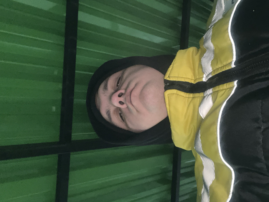 A male individual is depicted in a close-up, low-angle photograph, looking directly upwards into the lens. The subject's face is visible from the chin to just above the eyebrows, presenting a neutral expression. He is wearing a black hooded garment with the hood pulled up, beneath a yellow and black padded jacket. The jacket features a central black zipper and two horizontal reflective white stripes across the upper chest and shoulders. The background consists of a uniformly bright green corrugated metal surface, consistent with a roof or ceiling structure, supported by dark horizontal and vertical metal beams. The lighting is moderate and even. The scene is situated in the city of Ромашка Нп, Russia.
