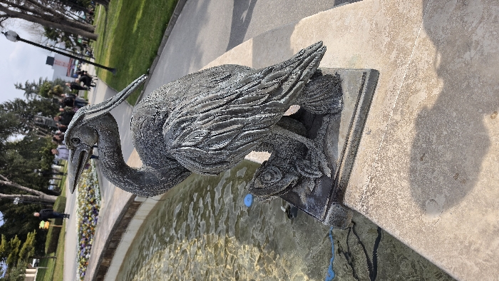 - "A weathered, dark grey metal sculpture of a heron stands on a rectangular plinth at the edge of a shallow fountain basin, located within Tsar Simeon's Garden in Plovdiv, Bulgaria" by FM-UgNOv2, licensed under CC BY 4.0
