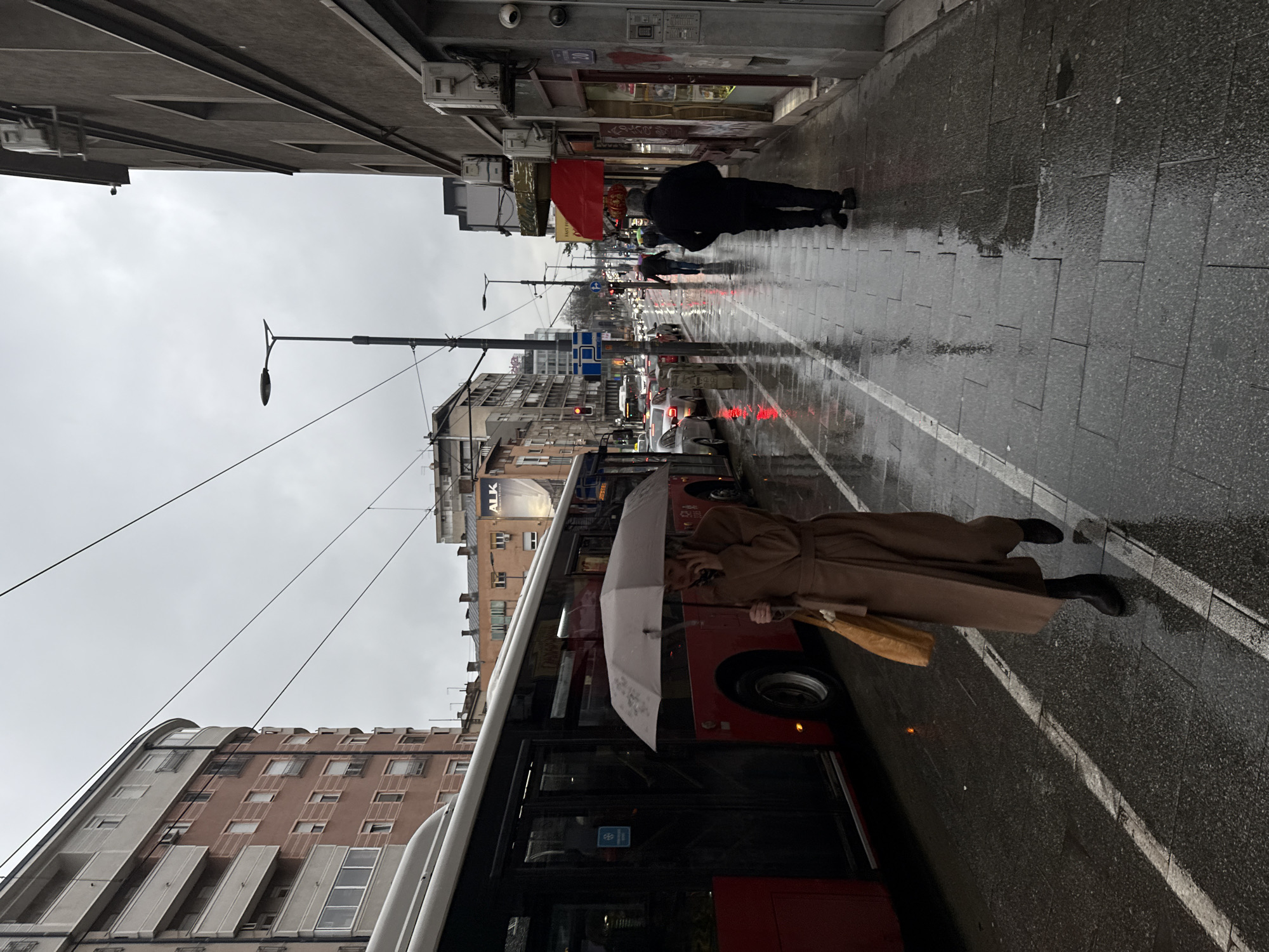 A street scene in Palilula Urban Municipality, Serbia. The setting is a wet, overcast day. A person in a tan coat holds a white umbrella and a yellow bag next to a red and white bus. Another person walks away down the sidewalk, holding a red umbrella. Other people and cars are visible down the street. The buildings lining the street are typical of urban architecture. Streetlights are present.