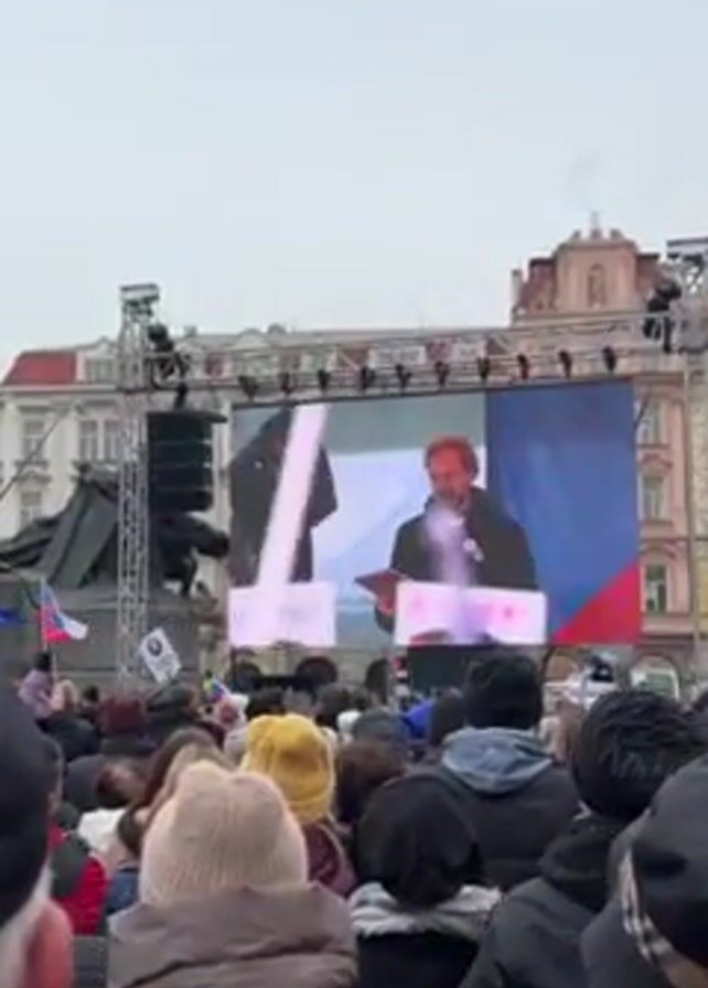large crowd of people gathered in front of a stage. On the stage, a large screen displays a person speaking at a podium. The camera zooms in on the screen, showing the speaker more clearly. The speaker is a man with a beard and mustache, and he is wearing a black jacket. The Czech flag is visible on the screen. The crowd is listening attentively to the speaker. The sky is overcast, and the buildings in the background are old and historic.