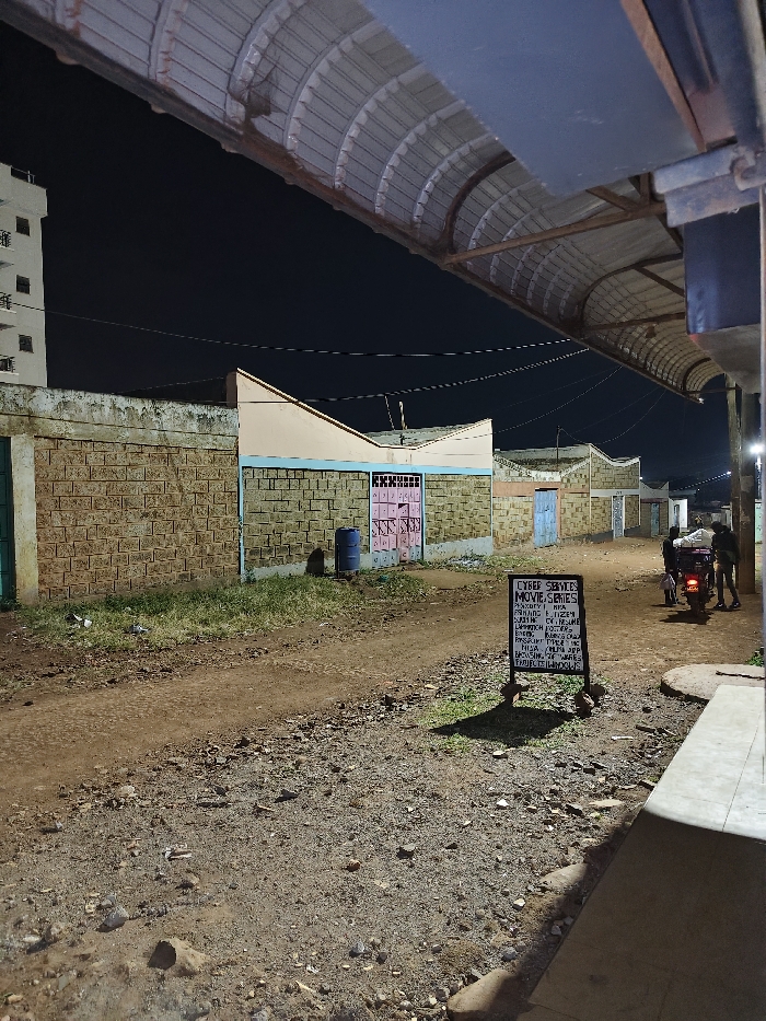 An outdoor shot at night shows a dirt road lined with brick buildings. Each building features a pitched roof and a brightly painted door. A sign for "Cyber Services, Movie Series" stands along the road. Further down, two people and a moped are visible. Overhead, a corrugated metal roof provides a partial covering over the foreground. Streetlights glow in the distance against the dark sky. A tall building stands on the left.