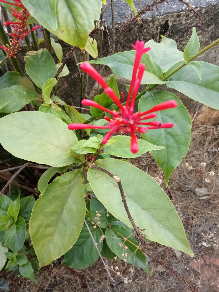 The image displays a plant featuring red flowers and green leaves, situated in Tinaquillo, Venezuela. A cluster of vibrant red, tubular flowers, composed of slender radiating petals or stamens, is prominent in the mid-right foreground, appearing slightly out of focus. A second, more focused cluster of similar red flowers is visible in the upper left background. The plant exhibits numerous ovate to elliptical green leaves of various sizes and shades, some showing minor surface irregularities or discoloration. Brown, woody stems are visible throughout the foliage. The background consists of a textured, grey concrete wall or structure in the upper left and central areas. The lower right portion of the scene reveals dry, brownish soil sparsely covered with desiccated vegetation. No human subjects, actions, or direct interactions are depicted.