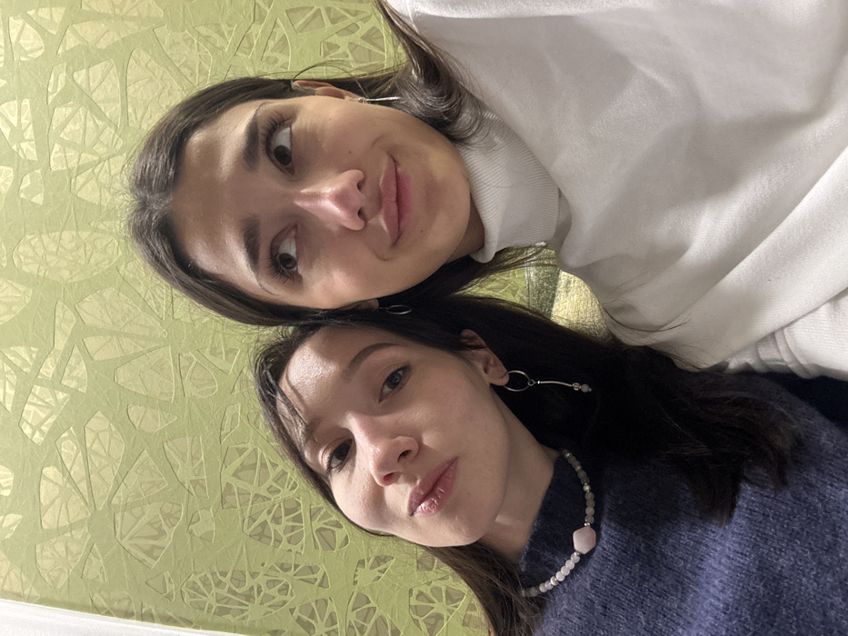 Two young women pose closely, their faces filling the frame, against a light green background with a geometric pattern. The woman on top wears a white turtleneck sweater and silver hoop earrings. The woman below wears a dark blue sweater and a necklace with a pink gemstone. Both have dark hair and light skin. The photo is taken at an angle, creating a casual and intimate feel.