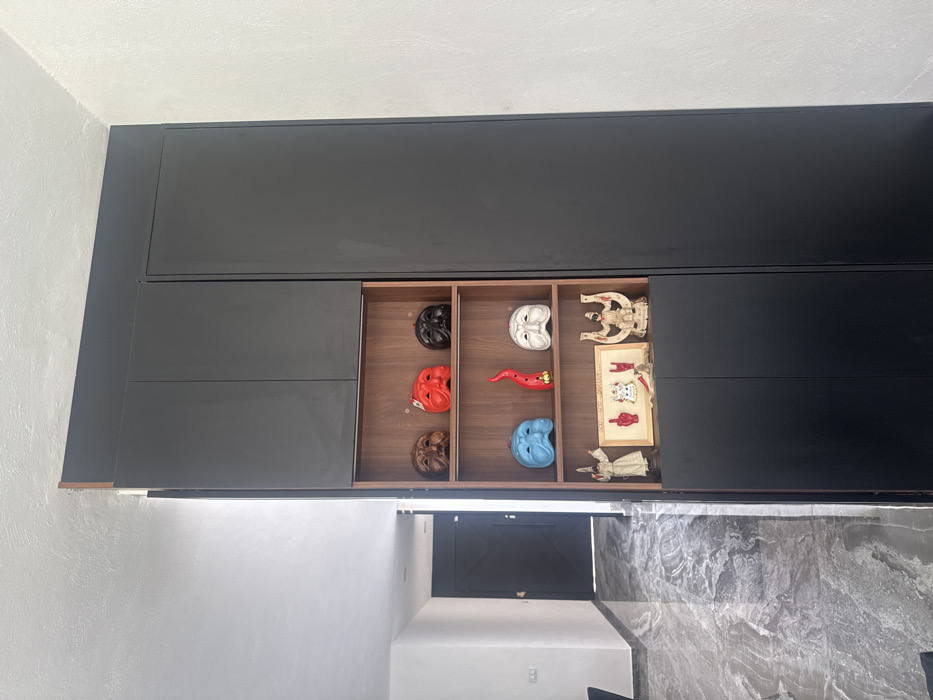 A black, built-in cabinet displays various decorative items within its open compartment. The items include several masks in different colors (black, white, red, and blue), a red horn-shaped figure, and small figurines alongside a framed illustration. The cabinet is positioned against a white wall, with a glimpse of a dark gray door and tiled flooring visible below. The composition is vertically oriented.
