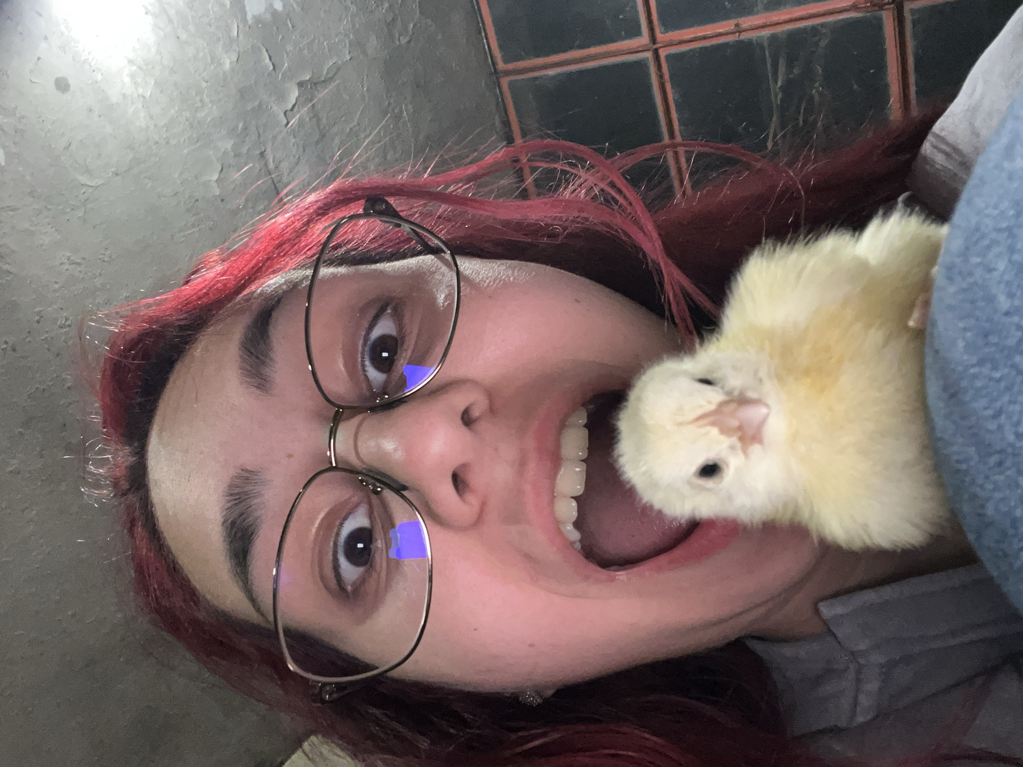 A person with red hair and glasses is holding a small yellow chick next to their open mouth