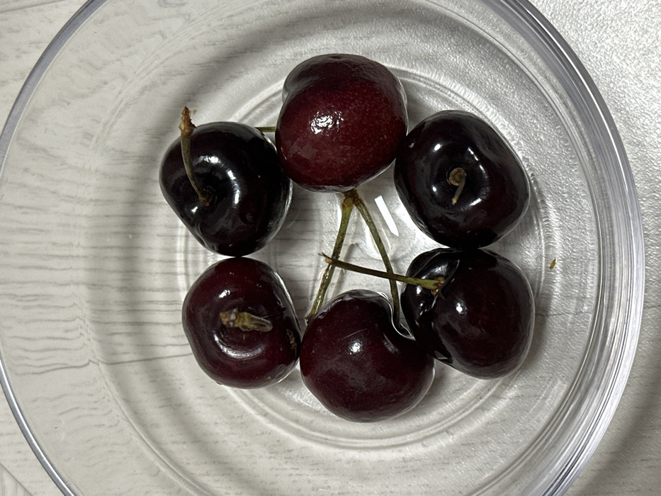 - "Six dark red to purplish-black cherries are presented in a clear, shallow, circular bowl" by FM-0RmwF2, licensed under CC BY 4.0