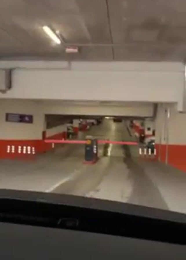 car entering an underground parking garage. A sign above the entrance reads "ULAZ ENTRY" next to a parking symbol and the number "10". A height restriction of 2.2 meters is also indicated on the sign. The car approaches a gate with red and white striped arms and orange bollards on either side. Inside the garage, parked cars can be seen in designated spaces. The walls are painted white and orange. The lighting is provided by overhead fluorescent lights. The perspective is from inside the car, looking forward through the windshield. The windshield is slightly wet. The car seems to be moving slowly. There's music playing in the background.