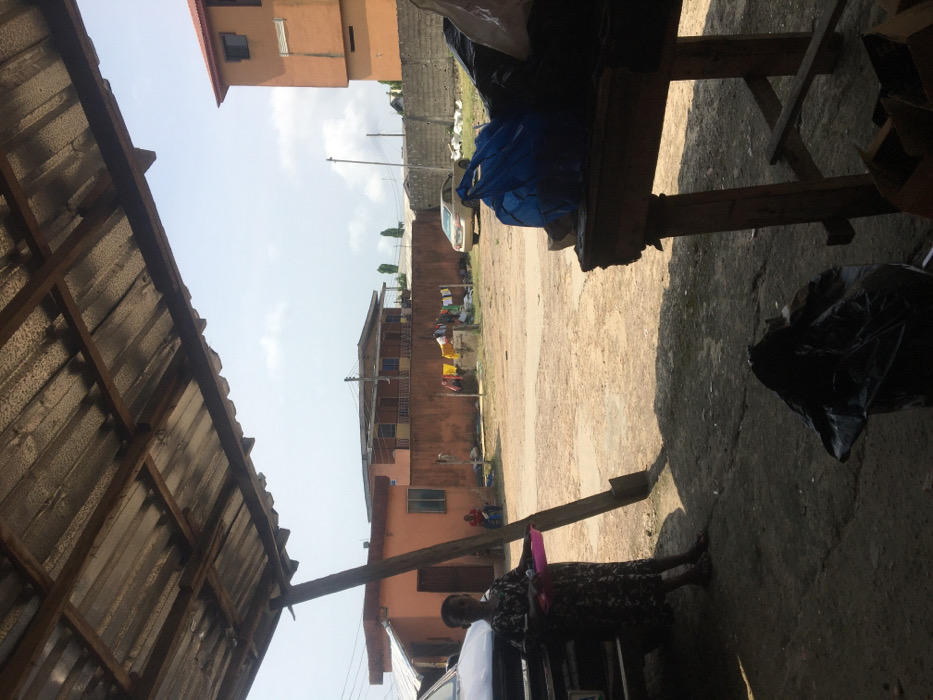The image captures an outdoor scene in Awjaw, Nigeria, under a corrugated metal roof supported by wooden beams
