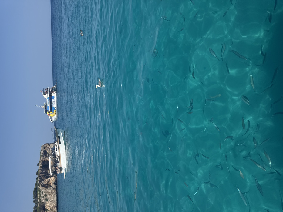 A serene scene displays crystal-clear turquoise water teeming with numerous small, silvery fish. Two white boats, one smaller than the other, float near a rocky, green-topped cliff. Two seagulls add life to the scene, one mid-flight and the other resting on the water's surface. The sky above is a clear, pale blue, suggesting a bright, sunny day. The composition is vertically oriented.