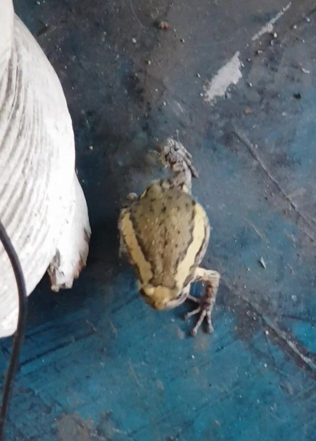 frog on a blue and gray surface. The frog is tan with brown stripes. A white object is in the bottom left corner of the frame. A black cord is visible along the bottom edge. The frog is not moving. Background noise can be heard.