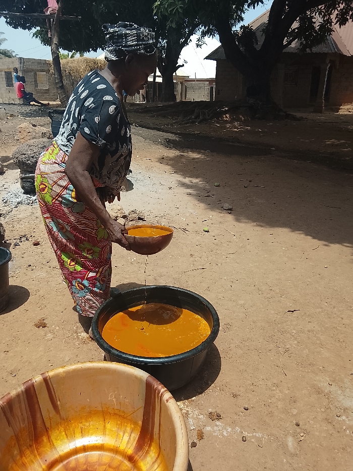 This image depicts an outdoor scene in a residential or communal area of Akwanga, Nigeria, under bright daylight. A dark-skinned, older woman, wearing a patterned headwrap, a black and white polka-dot short-sleeved top, and a multi-colored wrapper, is centrally positioned, leaning forward. She is actively pouring a golden-orange liquid from a brown, natural bowl, with visible drips, into a larger, black plastic basin that already contains the same liquid. A second, beige plastic basin, marked with orange residue, rests on the dirt ground in the lower-left foreground. The ground consists of uneven, reddish-brown dirt with scattered small debris. In the background, several mature trees with prominent roots and green foliage are visible. Structural elements include a partially constructed or dilapidated building with reddish walls on the far left, near which two individuals are faintly discernible, one appearing to wear a red shirt and seated or crouching. Further to the right, residential buildings with reddish-brown walls and dark, likely corrugated iron, roofs complete the background.