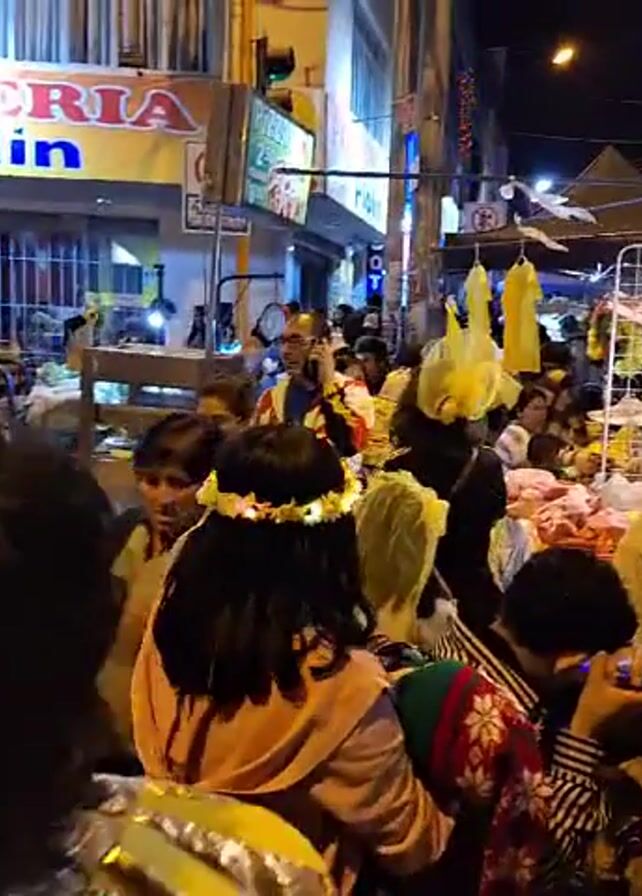 crowded street market at night. People are milling around, some looking at goods on display. There are vendors and customers. Some people are on their phones. The market is lit by street lights and the lights from the shops. The shops on the side of the street are visible. The market stalls appear to be selling various items, including food and clothing. One person is wearing a floral crown. The atmosphere seems busy and lively.