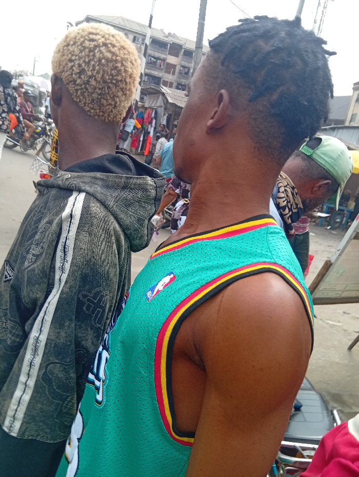 The scene is an outdoor urban environment within ARIDICA, Nigeria, appearing to be a bustling market street during daylight. Two individuals are featured in the foreground, observed from behind. The subject on the left exhibits short, bleached blond, curly hair and wears a dark-toned hooded jacket with white vertical stripes and an embossed pattern. The subject on the right has dark dreadlocks with faded sides and is dressed in a green sleeveless NBA jersey featuring red, yellow, and black trim around the neckline and armholes; a faint, vertical linear mark is discernible on his right shoulder. In the mid-ground and background, numerous other individuals are visible, indicating a crowded public space. Market stalls displaying clothing are present. Multi-story buildings constitute the far background. On the left side of the background, at least two motorcycles are parked or in motion. To the right of the central subjects, an individual wearing a light green baseball cap is partially visible. The overall environment suggests an active commercial area.