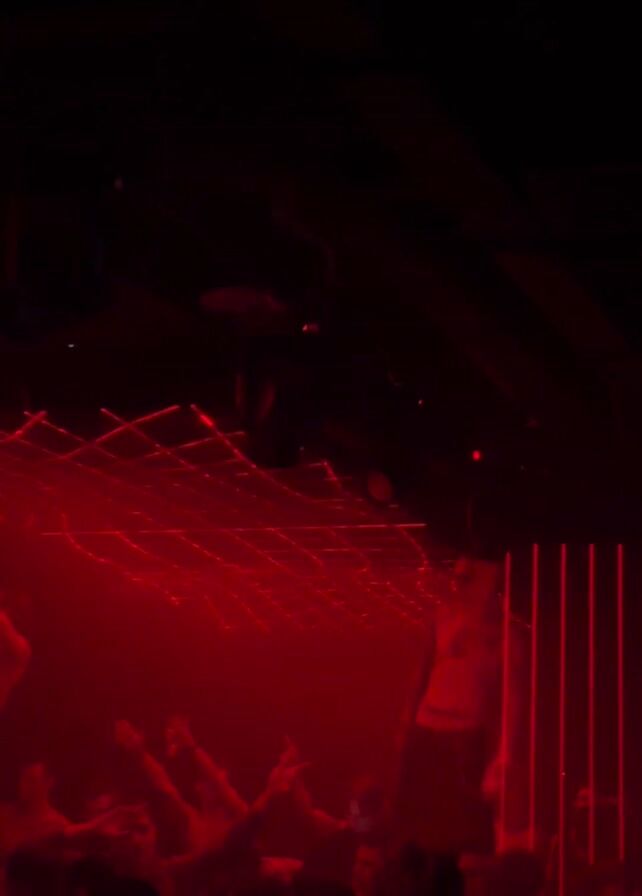 A dimly lit, red-toned nightclub environment is shown. A crowd of people, visible only as silhouettes, are moving and raising their hands. Two shirtless individuals are seen among them. A complex grid-like structure hangs above the crowd, illuminated with red light. The illumination is provided by a moving red light projector. The overall atmosphere is active and energetic.