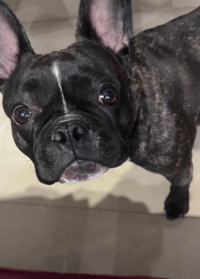 A small, dark-colored French Bulldog with a white stripe on its forehead is standing on a light-colored tiled floor and looking up at the camera