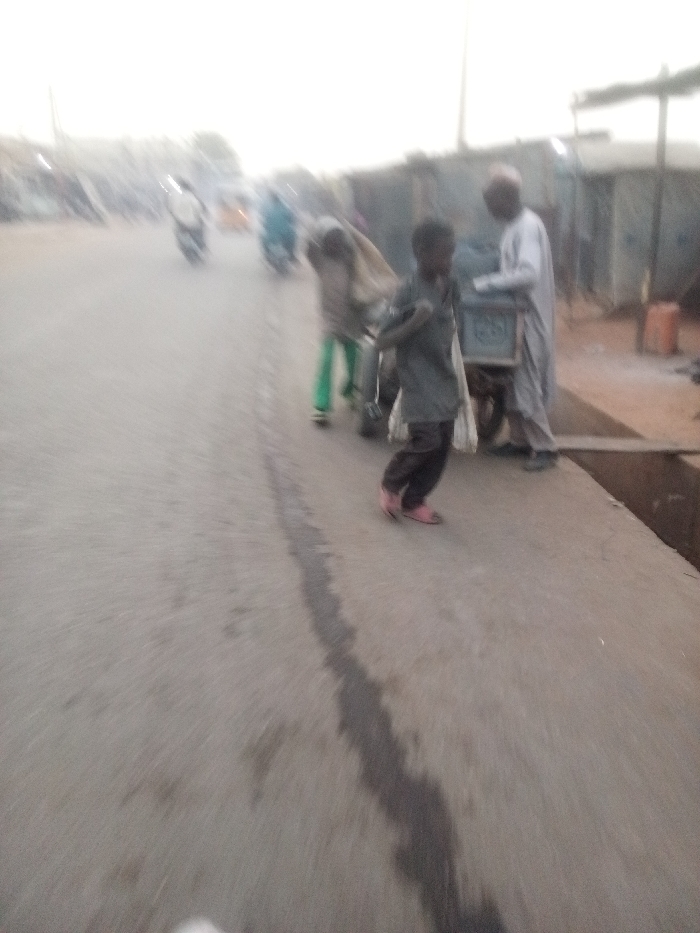 A blurry image captures a street scene. Several individuals are present, including a child in the foreground, clad in a grey shirt and dark pants, walking. Two people are standing beside a cart. An older man is standing to the right of the cart. Two motorbikes are seen on the street behind the people. The setting appears to be an urban area with buildings or structures visible in the background. The overall image suffers from motion blur and poor lighting, making details difficult to discern.