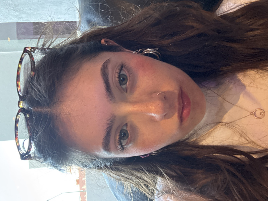 A young woman with fair skin, green eyes, and brown hair faces the camera. She wears eyeglasses perched on her head, hoop earrings, and a dainty necklace. A subtle nose ring adorns her left nostril. The lighting casts a warm glow on her face, emphasizing her features. The background is indistinct but appears to be an indoor setting.