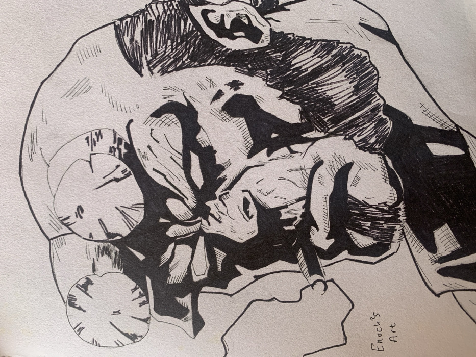 - "This is a black and white ink drawing on light-colored paper, depicting a head-and-shoulders portrait of a stylized, muscular male character" by FM-ymt3j1, licensed under CC BY 4.0