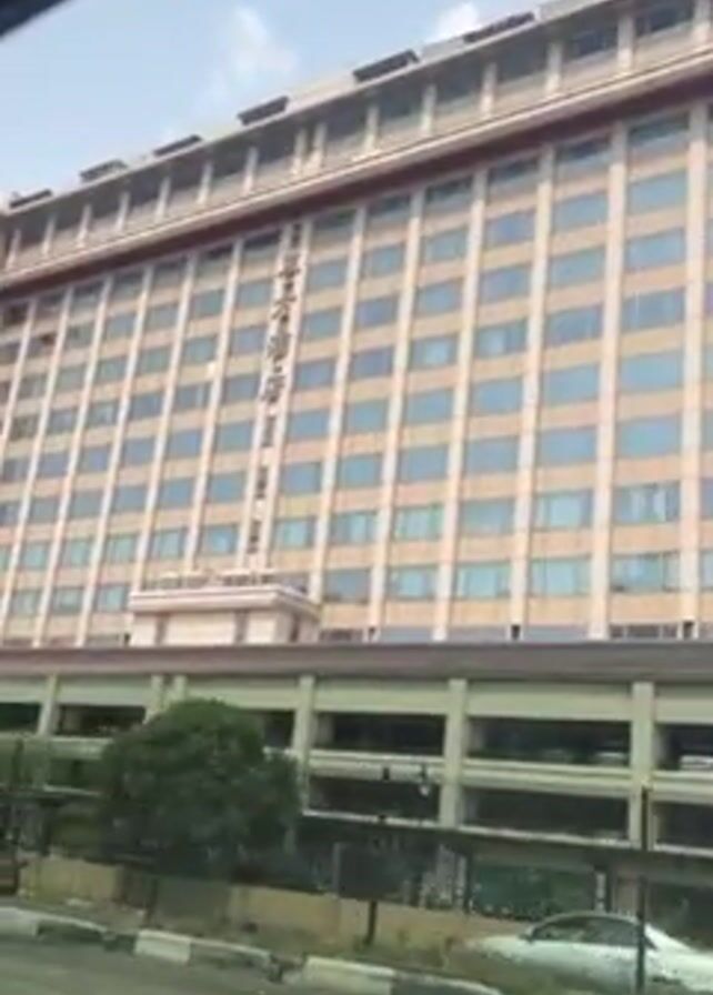 From inside a vehicle, a tall building comes into view. It is the Oriental Hotel. Cars and people are visible outside the building. The sky is overcast. The vehicle is in motion.