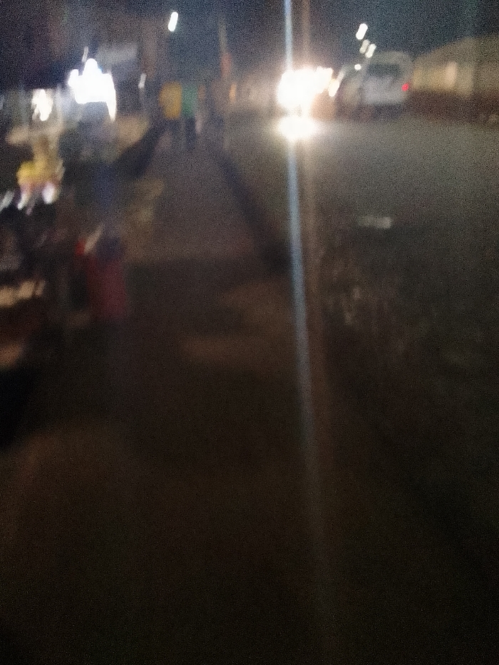 A blurry, dimly lit street scene at night