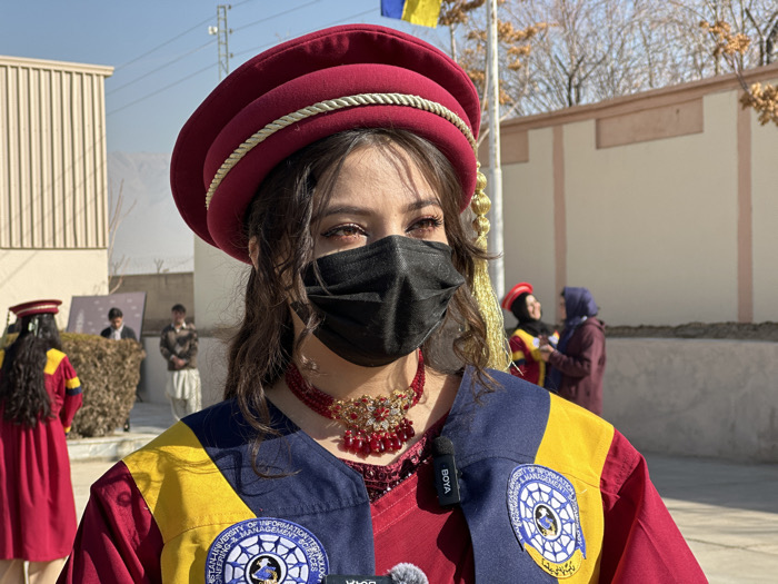 - "A woman in a graduation gown and matching hat, wearing a black face mask and ornate necklace, stands outdoors" by FM-KEB4x1, licensed under CC BY 4.0