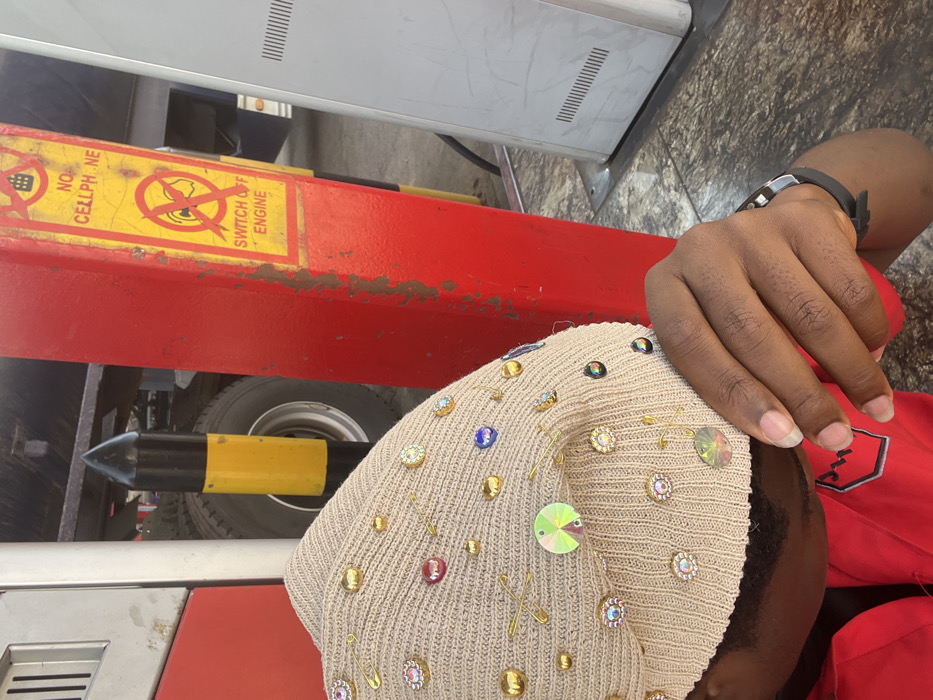 The image depicts a close-up, downward-angled view of a person at a petrol station, likely located in Jos, Nigeria, though a precise location within the city is not identifiable from visual cues. The central subject is the upper portion of a person's head, adorned with a beige knitted hat. The hat is extensively embellished with numerous small, round metallic gold studs, various circular and oval-shaped rhinestones in clear, iridescent, purple, blue, and red hues, and several small gold-colored safety pins. Thin gold-colored wire patterns are also integrated into the hat's design. The person's dark-skinned right hand, exhibiting manicured fingernails, is positioned near the hat's brim, and a black watch or wristband is visible on their right wrist. A portion of a red garment, possibly a shirt, with a black hexagonal logo (partially visible) is also present. The background shows elements typical of a petrol station. A weathered red vertical support pillar is prominent, featuring two yellow warning signs. The upper sign reads "NO CELLPHONE" with a crossed-out phone icon, and the lower sign reads "SWITCH OFF ENGINE" with a crossed-out engine icon. To the left of this pillar, a black and yellow striped bollard is visible. Behind these structures, a large vehicle's tire and undercarriage are discernible, consistent with a truck or tanker. On the far right, a segment of a silver-grey fuel dispenser is visible. The ground appears to be a paved surface. No specific actions or interactions beyond the person's presence in this environment are evident.