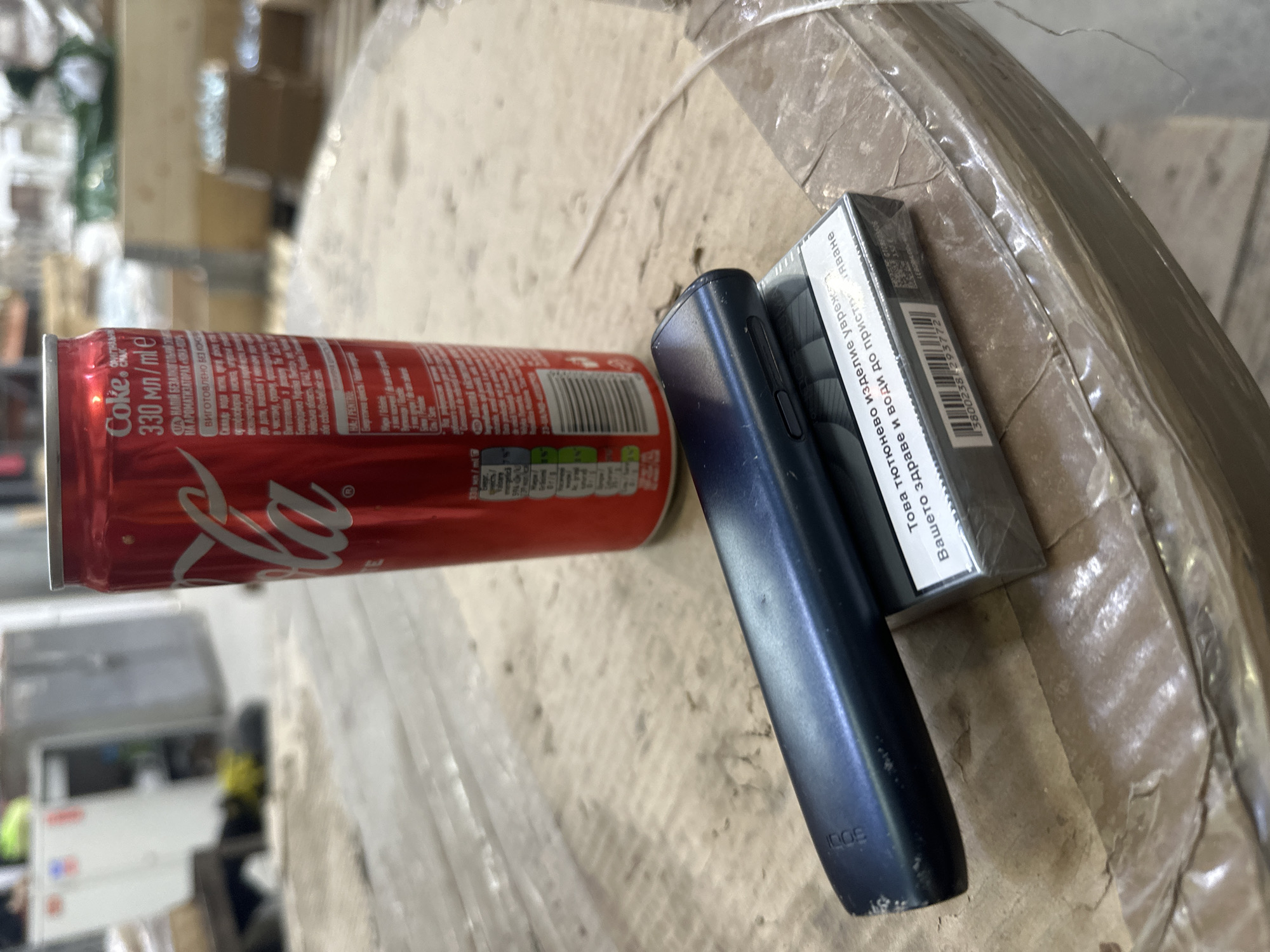 The image displays a still life scene set indoors, in an industrial or workshop environment within the city of Sevlievo, Bulgaria. In the foreground, three distinct objects are arranged on a flat, light brown surface, which is partially covered by clear packing tape exhibiting creases and reflections. A dark grey, plastic-wrapped pack of cigarettes rests on this surface. The pack features a prominent white health warning in Bulgarian, which translates to "This tobacco product harms your health and leads to addiction." A barcode "3800238293772" is also visible on the packaging. Positioned on top of this cigarette pack is a dark blue, elongated IQOS device, cylindrical in form with rounded ends. The brand name "IQOS" is visible on its side, and the device shows minor surface wear, particularly towards its left end. Standing upright to the right of these items is a red Coca-Cola can, clearly labeled "Coke" and indicating a volume of "330 ml/ml," with additional Cyrillic text visible on its label. The background is significantly blurred, indicating a shallow depth of field. It depicts an interior setting with various indistinct objects, including a white metal cabinet or shelving unit on the far left, a grey metal container further back, and other blurry industrial equipment or storage items. Portions of what appears to be a light-colored concrete floor are also visible in the background. No individuals are present in the scene, and no actions or interactions are depicted beyond the static arrangement of the objects.