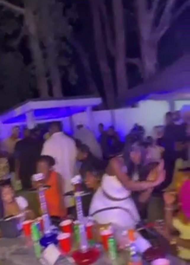 crowded outdoor party scene at night. Several people are dancing, including one woman in a bright pink outfit who raises her hand in the air. There are also people standing and talking. A bar area is visible in the foreground, featuring several hookahs, red cups, and cans. The background includes trees and a building with blue lights. The party appears lively with music playing and people enjoying themselves.