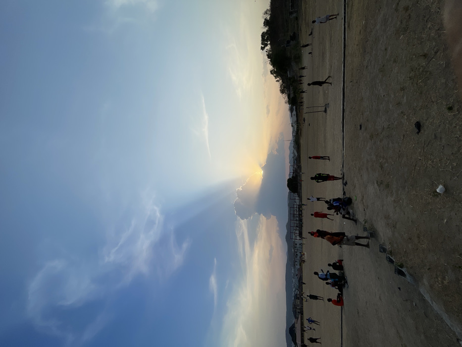 A landscape view displays a setting sun partially obscured by a cloud, with prominent sun rays streaking into a blue sky. Below, a large dirt field is populated with multiple people, possibly athletes, engaged in various activities. A line of trees is visible on the horizon, further emphasizing the vastness of the field. The scene suggests late afternoon or early evening due to the sunset.