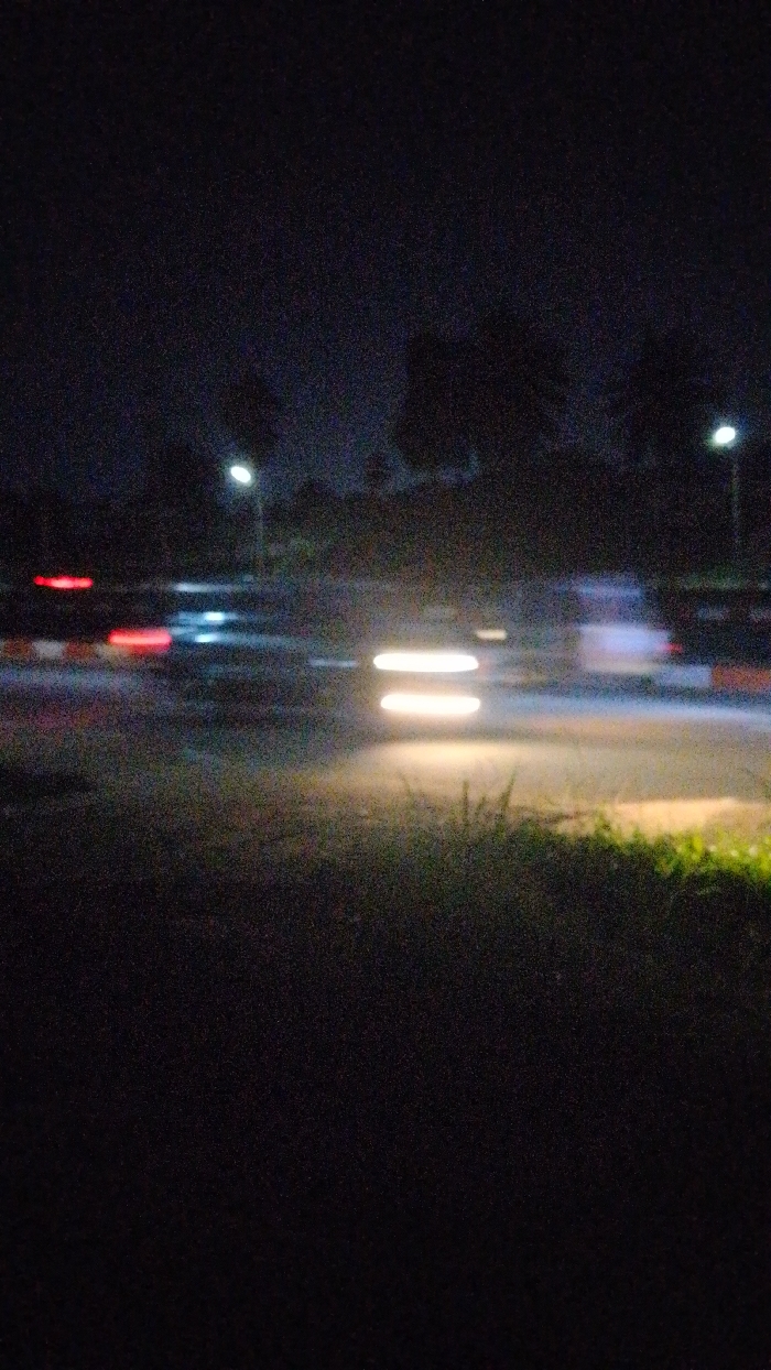 The image captures a night scene on a road with blurred motion