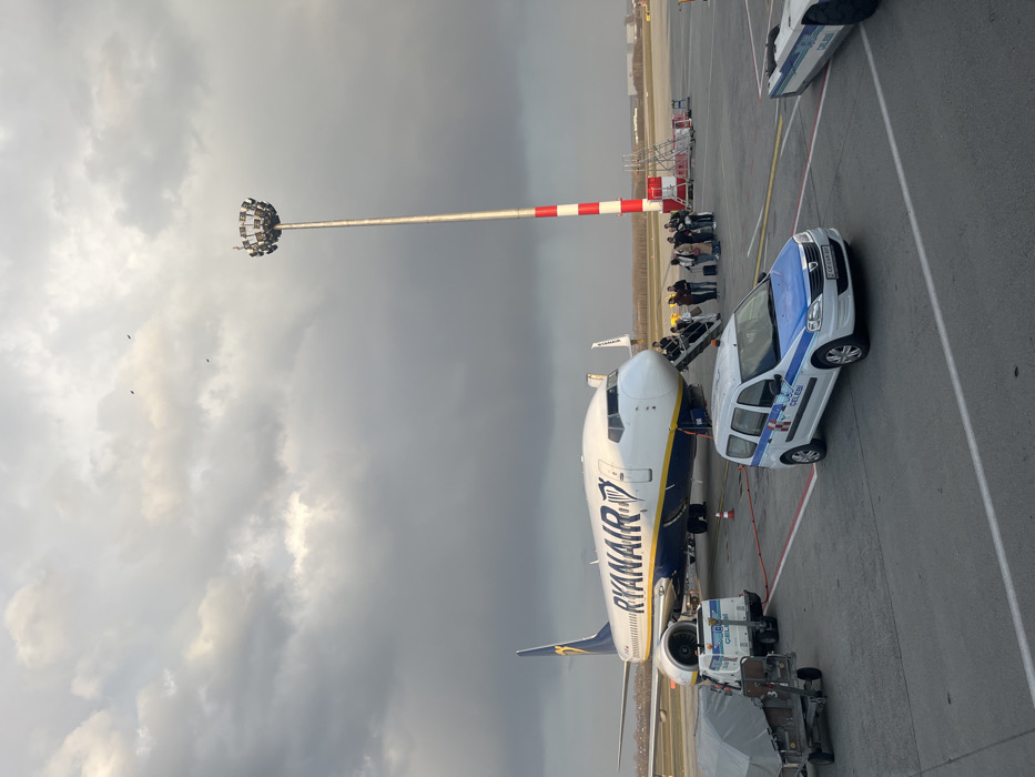 An airport tarmac scene at Budapest Ferenc Liszt International Airport (BUD) in Budapest, Hungary, is depicted under an overcast sky. A white and blue Ryanair Boeing 737 passenger aircraft is parked on the asphalt tarmac, with the "RYANAIR" livery prominently displayed on its fuselage. Approximately 10 to 15 passengers are in the process of boarding the aircraft via a mobile stair connected to the forward left entry door. These individuals, dressed in casual attire, are seen carrying personal belongings. In the foreground, a white Dacia Logan MCV van, bearing "CELEBI" branding and a Hungarian license plate (CEG-648-907), is parked, oriented towards the right. To the left of the aircraft's nose, a white ground service vehicle, also marked "CELEBI," is attached to a grey, covered baggage cart. A tall, slender light pole with a circular array of floodlights at its apex, featuring red and white striped markings on its lower section, stands prominently on the right side of the frame. Two orange traffic cones are positioned near the aircraft's nose landing gear. A partial view of another Celebi-branded ground support vehicle is visible on the far right. The sky is largely covered by dark grey clouds, with brighter patches overhead. Three small, dark avian silhouettes are visible against the upper sky. A distant treeline and low-rise airport structures are visible on the horizon.