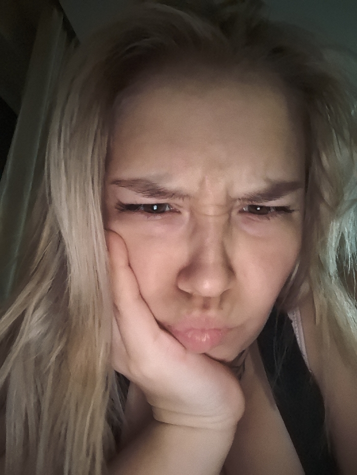 A close-up portrait shows a young Caucasian female with long, light blonde hair. Her face is centered in the frame, angled slightly downwards, with a direct gaze toward the camera. She exhibits a strong frown, characterized by furrowed eyebrows drawn together, causing multiple horizontal wrinkles on her forehead and vertical lines between her brows. Her eyes are partially squinted, dark in color, and her lips are slightly pursed. Her left hand is positioned with the palm resting against her lower left cheek and chin, fingers extending upwards along her face. She is wearing a dark garment, possibly a tank top or bra strap, visible on her right shoulder. The background is indistinct and dark, indicating an indoor setting with low ambient light or a shallow depth of field. The lighting primarily illuminates her face from the front. The precise location within the city of Krasnoyarsk, Russia, cannot be determined from the visual information provided in the image.
