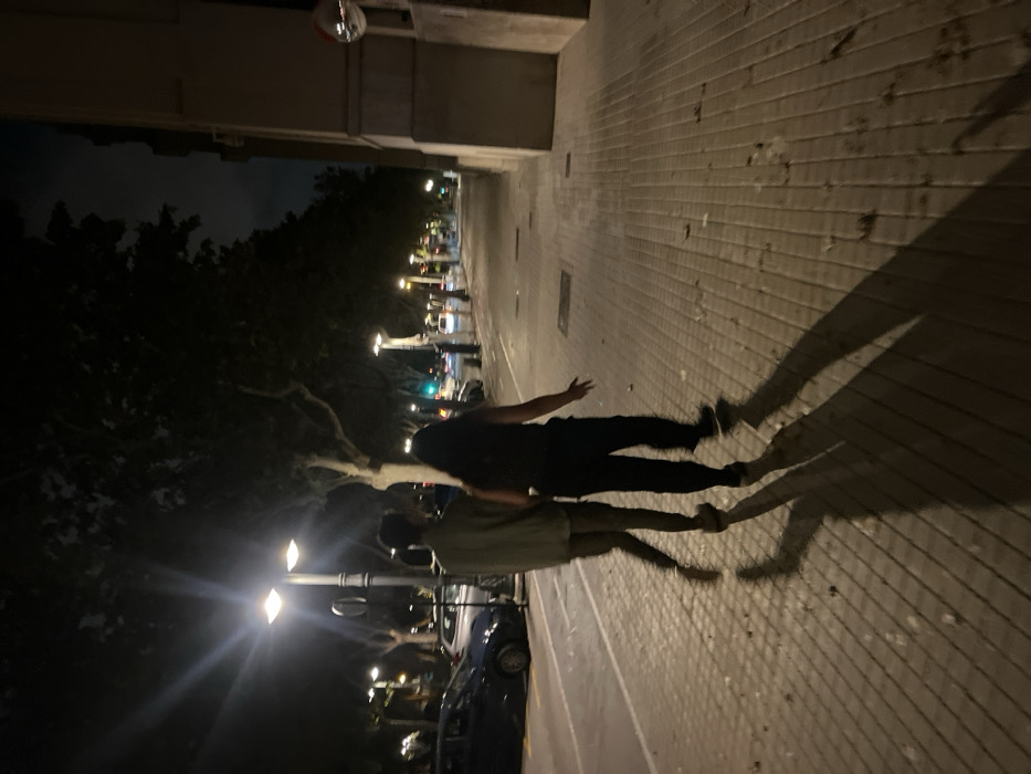 This nighttime image captures an urban scene in Valencia, Spain. Two individuals are observed from behind, walking away from the camera on a light-colored paved sidewalk composed of rectangular pavers. The person on the left wears a light-toned long-sleeved shirt or jacket and dark trousers. The person on the right, with long dark hair, wears dark attire and has their right arm slightly extended with an open hand gesture. Both individuals cast long, dark shadows across the sidewalk, extending towards the foreground. To the left of the sidewalk, a tree-lined street is present. Multiple bright, warm-toned streetlights with dual fixtures illuminate the area and penetrate the dark foliage of the mature trees. Along the street, parked vehicles are visible, including a dark blue hatchback in the mid-ground. Additional vehicle lights and a green traffic signal are discernible further in the distance, indicating active traffic. On the far right of the image, a light-colored building facade runs parallel to the sidewalk. A circular, convex security mirror is affixed to a corner of this building. The sky above is dark, showing faint cloud formations. Scattered small debris is visible on the sidewalk surface.