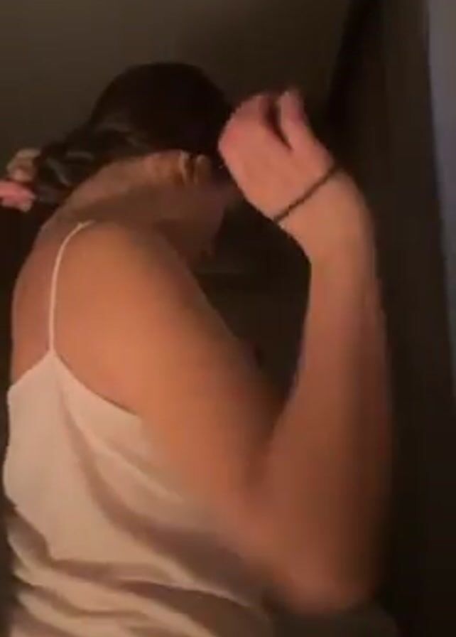 A woman in a white spaghetti strap top is standing in a room with dark curtains. She turns her back to the camera and puts her hair up in a ponytail. Her hair is long and brown. She has a black hair tie on her wrist that she uses to secure her hair. The lighting in the room is dim. There is a small white piece of furniture visible behind the woman.