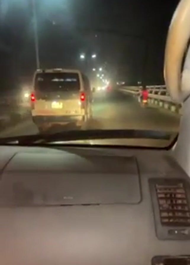 A view from inside a car driving on a lit road at night. A vehicle is ahead in the same lane. A person is riding a motorcycle to the right. The car’s dashboard and partial steering wheel are visible. Music is playing.