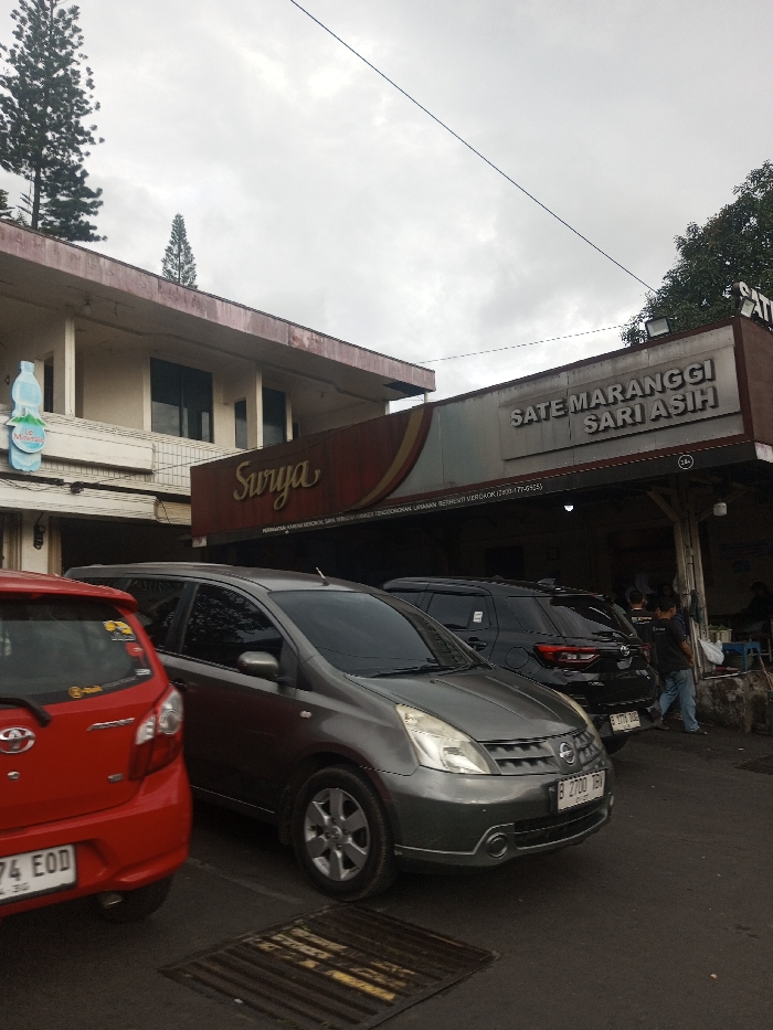The image depicts an overcast street scene in Indonesia, indicated by the visible license plate prefixes 'B' (Jakarta) and 'D' (Bandung) on the vehicles, and signage in Indonesian. In the foreground, a red Toyota Agya is parked on the left, displaying a partial license plate "D 74 EOD." Directly behind it, a grey Nissan Grand Livina is parked, showing license plate "B 2700 TBN." To its right, the rear of a black SUV, possibly a Toyota Raize, is visible with license plate "B 3770 DUG." The background features two connected buildings. The left structure is a two-story building with a light-colored facade, dark windows, and a brown roofline. A blue, bottle-shaped "Le Minerale" sign is affixed to its first floor, and a red-and-gold sign with the script word "Surya" is mounted above the ground floor. The right section of the background building houses an open-fronted eatery under a large brown sign that reads "SATE MARANGGI SARI ASIH," a common Indonesian dish, with additional smaller text below it. Several individuals are present near this eatery, with one person in a light blue shirt and jeans walking towards the left. Overhead utility wires traverse the cloudy sky. A metal grate is on the asphalt in the bottom-center foreground.